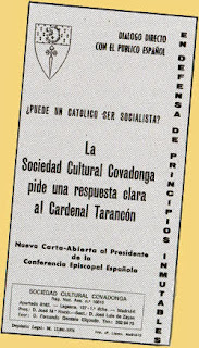 Los de la TFP (versión española) se insurgieron moderadamente (y dentro de un orden) frente a la conmoción inegable que produjo entre la opinion pública y en la actualidad política o político/religiosa de la España de entonces la Asamblea Conjunta de Obispos y Sacerdotes patrocinada por el cardenal Tarancón (septiembre del 71) Hoy pienso que la frase aquella que tanto nos escandalizó e indignó a algunos de "pedir perdón porque la iglesia no habia sabido ser ministro de reconciliacion en el seno de un pueblo dividio por una guerra entre hermanos" (y cito de memoria, desde entonces) escondía un fondo de verdad, pero no dejaba de ser menos hipócrita y capciosa, en la medida que el efecto de las palabras aquellas en el contexto de entonces era el venir a echar leña al fuego , no a reconciliar, si no a encizañar y a encismar más que a otra cosa. Como ocurriría décadas después con la ley (funesta) de la Memoria que la iglesia española también patrocinaría, a su manera¿Me equivoqué, vi fantasmas donde no los había, arremetiendo contra la política de la iglesia española en aquellos años del tardofranquismo tardío ya tan lejano en el tiempo? Errare humanum est, pero cuarenta años después sigo (grosso modo) en mis trece. La política religiosa del Vaticano en España o la fatalidad judeocristiana en nuestra historia. Algo así atisbó y denunció Rafael Sánchez Mazas en su libro prohibido (de 1932) y más de ochenta años después la historia se diría que le da la razón, o en otros términos, que se repite.