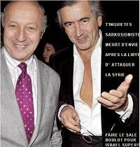 Dios los cría y ellos se juntan. El ministro francés de exteriores Laurent Fabius y Bernard-Henri Lévy (que allí ya conocen) en confraternización risueña cuando los tiempos eran igualmente risueños para ambos. Pero los tiempos y los vientos cambiaron desde el ataque que/no/fue -frustrado in extremis- contra Damasco hace ahora un año, que el primero de los dos nombrados rememoraba ahora hace unos días en tonos de lamentación jeremiaca (“hubiera cambiado la historia”) Fabius acaba de declararse resueltamente opuesto a los ataques contra el Ejercito del Levante en territorio sirio so pretexto de que favorecen a Assad. ¿Pura estratagema? ¿Prolegómenos de una nueva tentativa –sinuosa y maquiavélica- de desestabilización del régimen de Bachar –el-Assad con el cuento de la amenaza del Estado Islámico? Planes de Obama en el Oriente Próximo ¡Lagarto, lagarto!